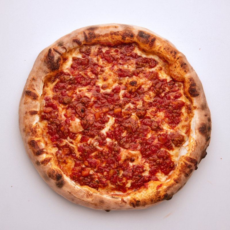 Sos domatesh, djath mozzarella, mish i bluar viç