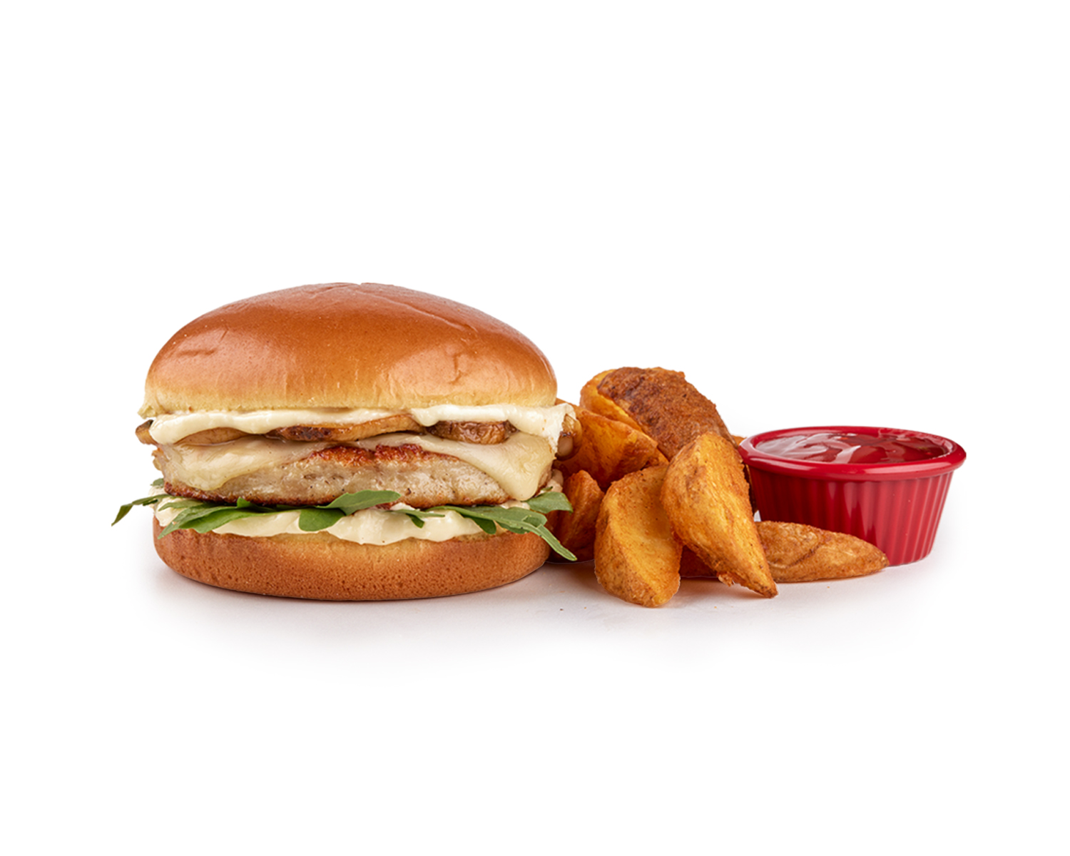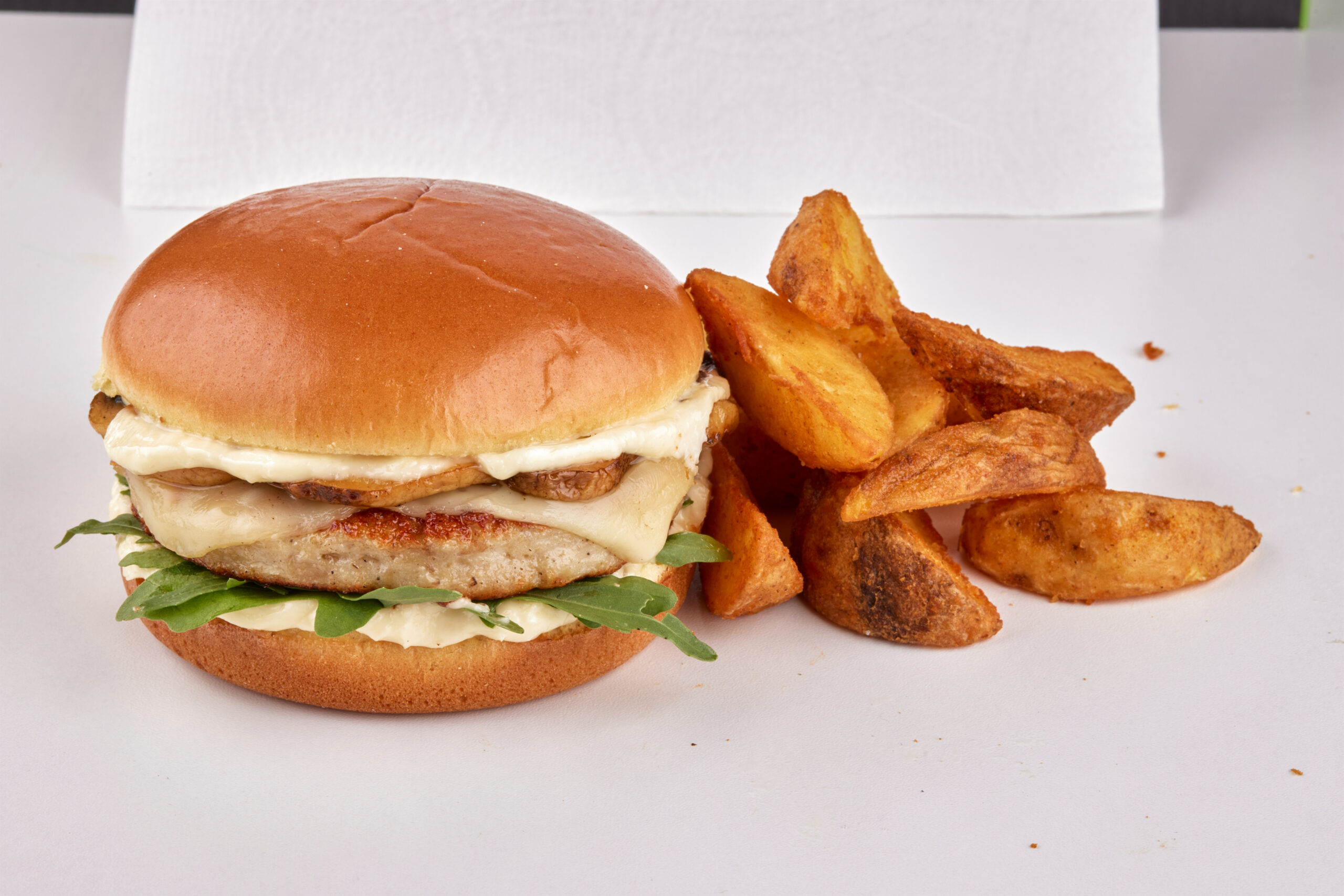 pleskavicë me mish pule- recetë shtëpiake, djath amerikan, qepë të fërguara, domate, sos, sallatë e gjelbërt, pomfrit