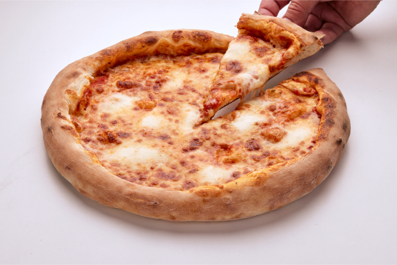 Sos domatesh, djath mozzarella, mish i bluar viç
