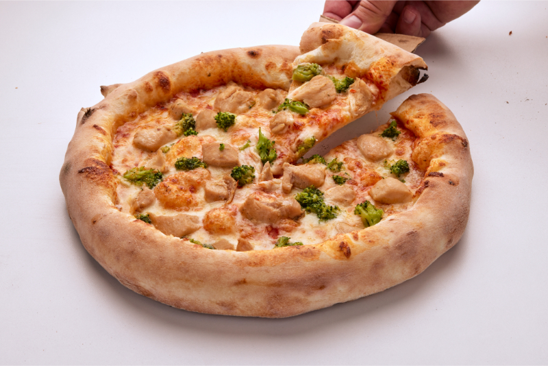Salcë domatesh, mozzarella, mish pule, brokoli, vaj me hudër.