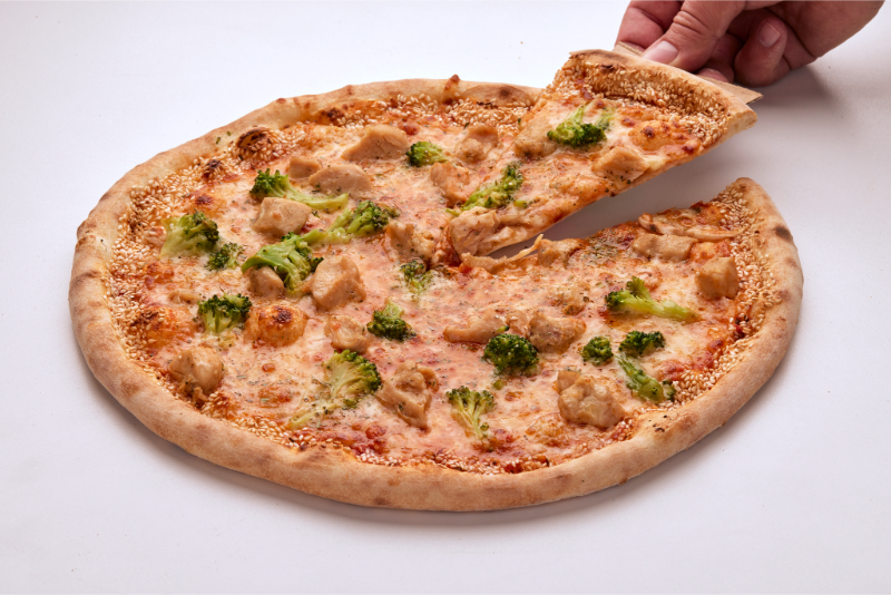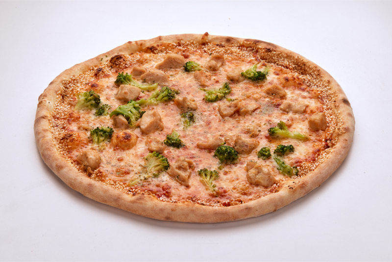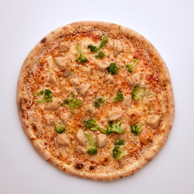 Salcë domatesh, mozzarella, mish pule, brokoli, vaj me hudër, susam, oregano.