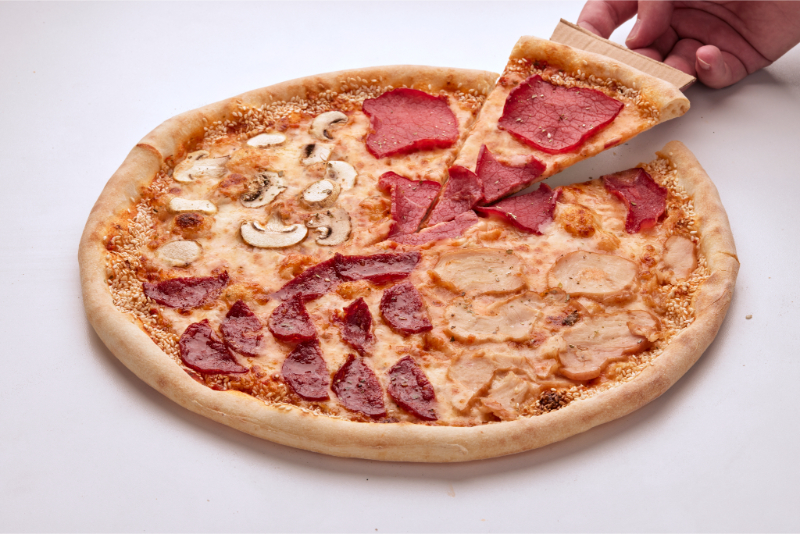 sos domatesh, djath kaçkavall, përshutë pule, përshutë viçi, suxhuk, këpurdha