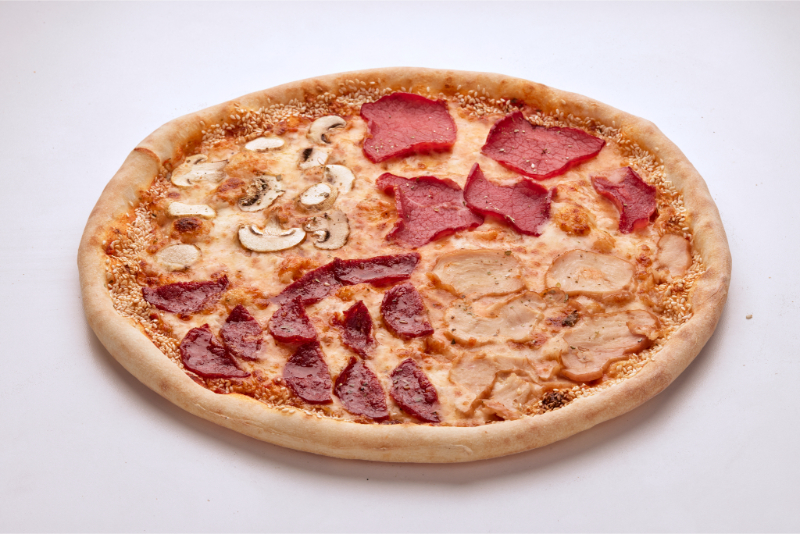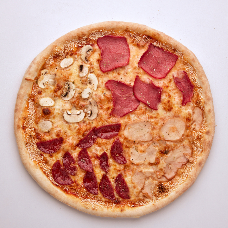 Salcë domatesh, mozzarella, suxhuk i tymosur, proshutë viçi, proshutë pule, këpurdha të freskëta, susam, oregano.