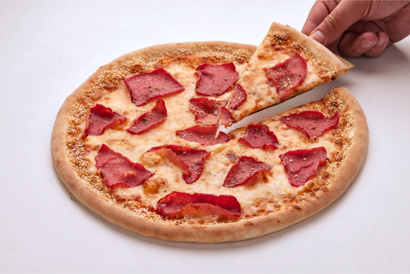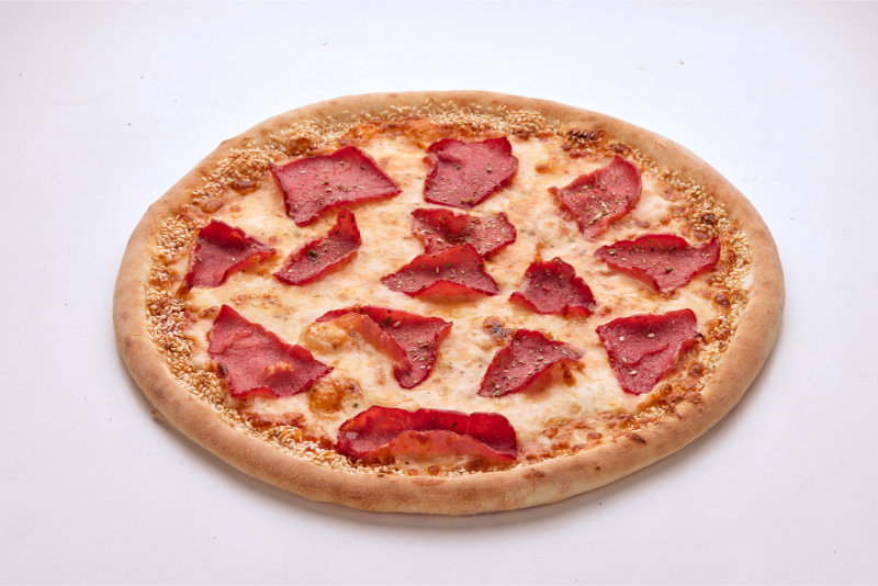 Salcë domatesh, mozzarella, proshutë viçi, susam, oregano.
