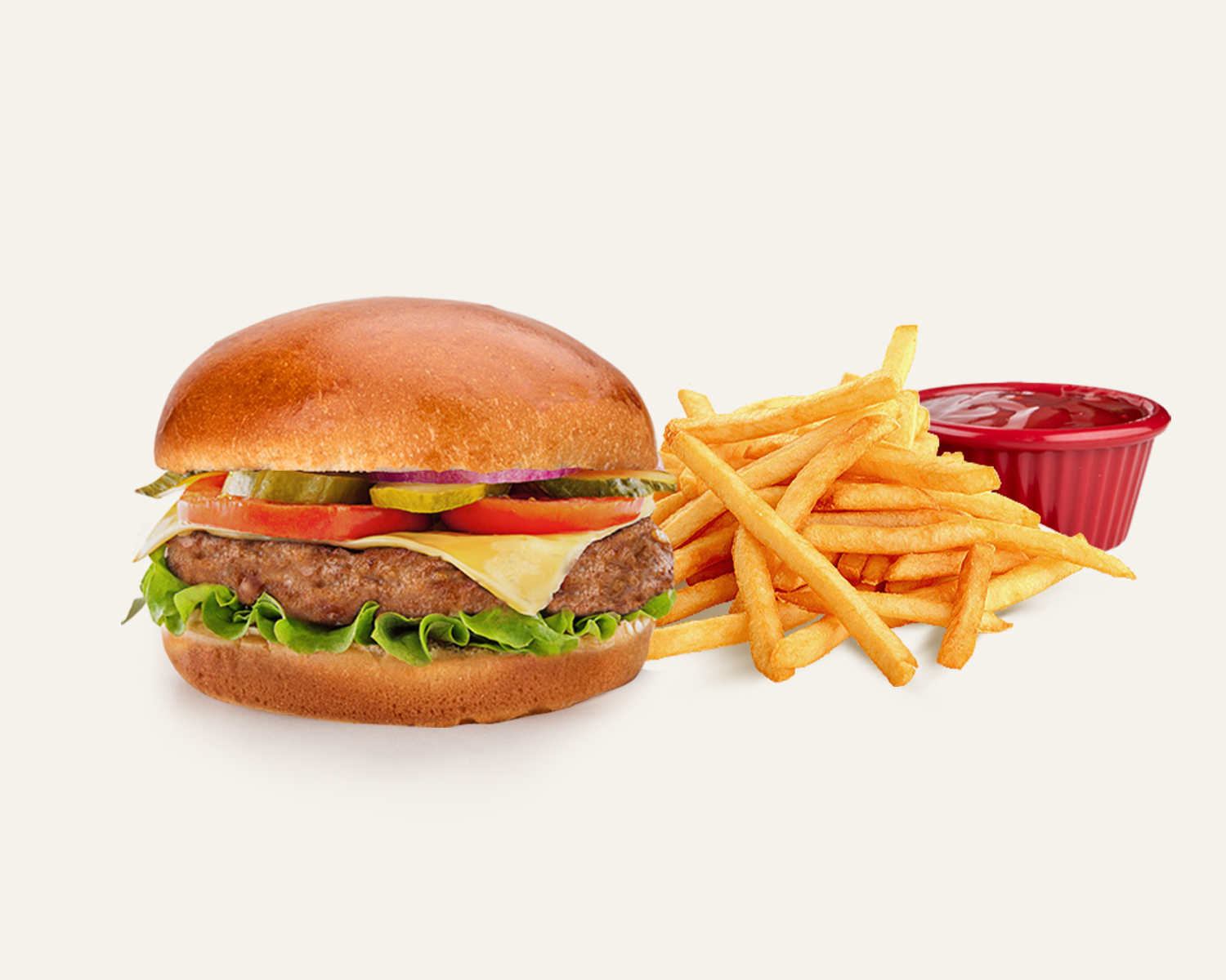 pleskavicë viçi, djath amerikan, domate, tranguj, qepë, sos BBQ, pomfrit