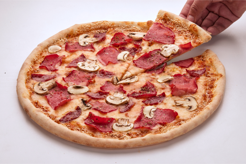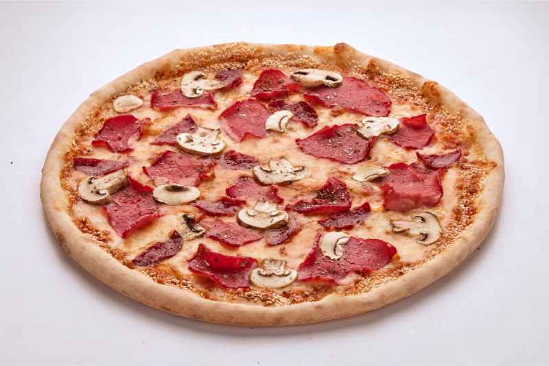 Salcë domatesh, mozzarella, proshutë viçi, suxhuk i tymosur, këpurdha të freskëta, susam, oregano.
