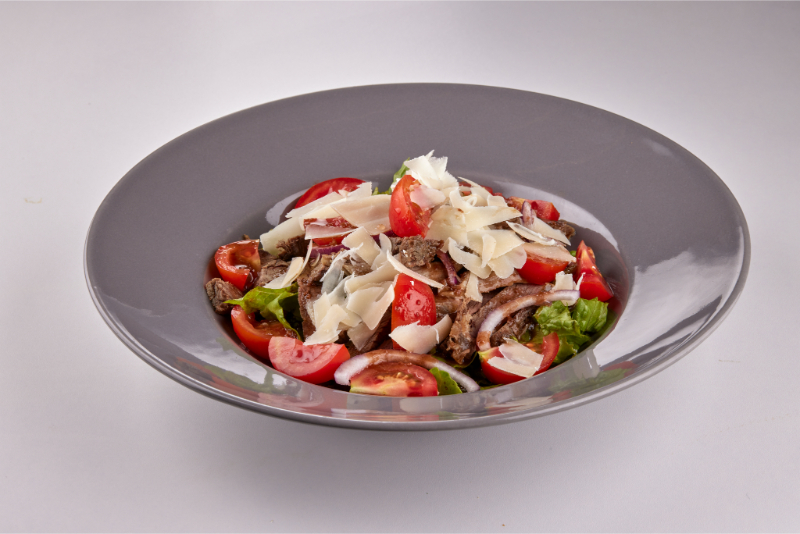 Domate, sallatë e gjelbër, mish viçi i marinuar, paremzan, qepë