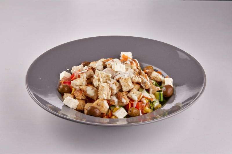 Sallatë, mish pule, salcë, parmezan, miser, karrotë, domate, qepë, tranguj.