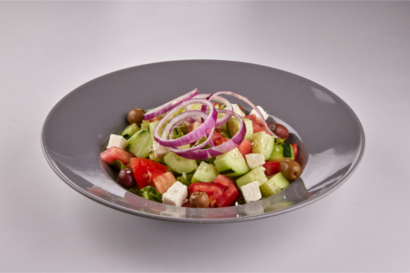 Sallatë, domate, djathë i bardhë, tranguj, qepë, karrotë dhe ullinjë.