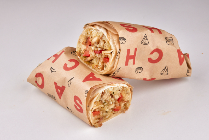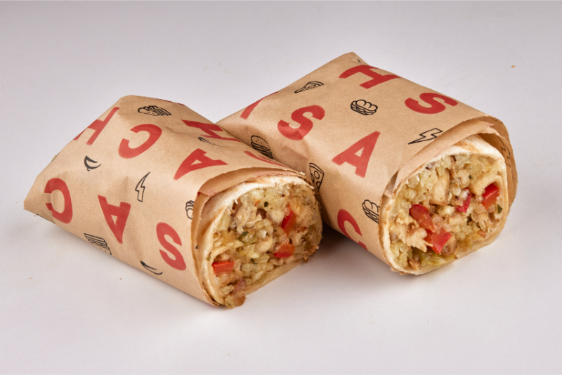Petë tortilla, oriz i zier, krem ajkë, speca të kuq, mish pule.