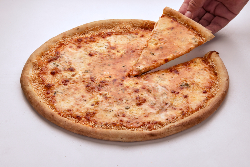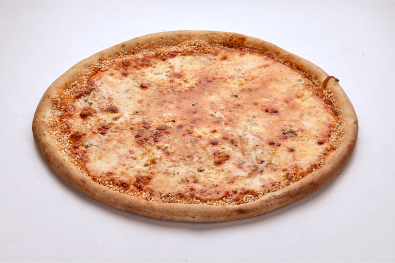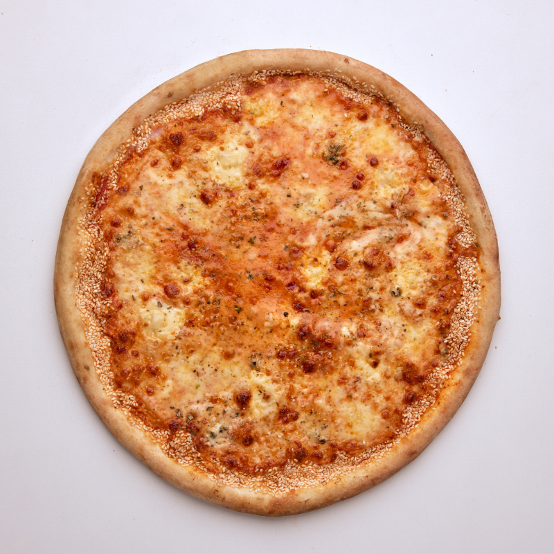 Salcë domatesh, mozzarella, gorgonzola, mozzarella e freskët, djath krem, susam, oregano.
