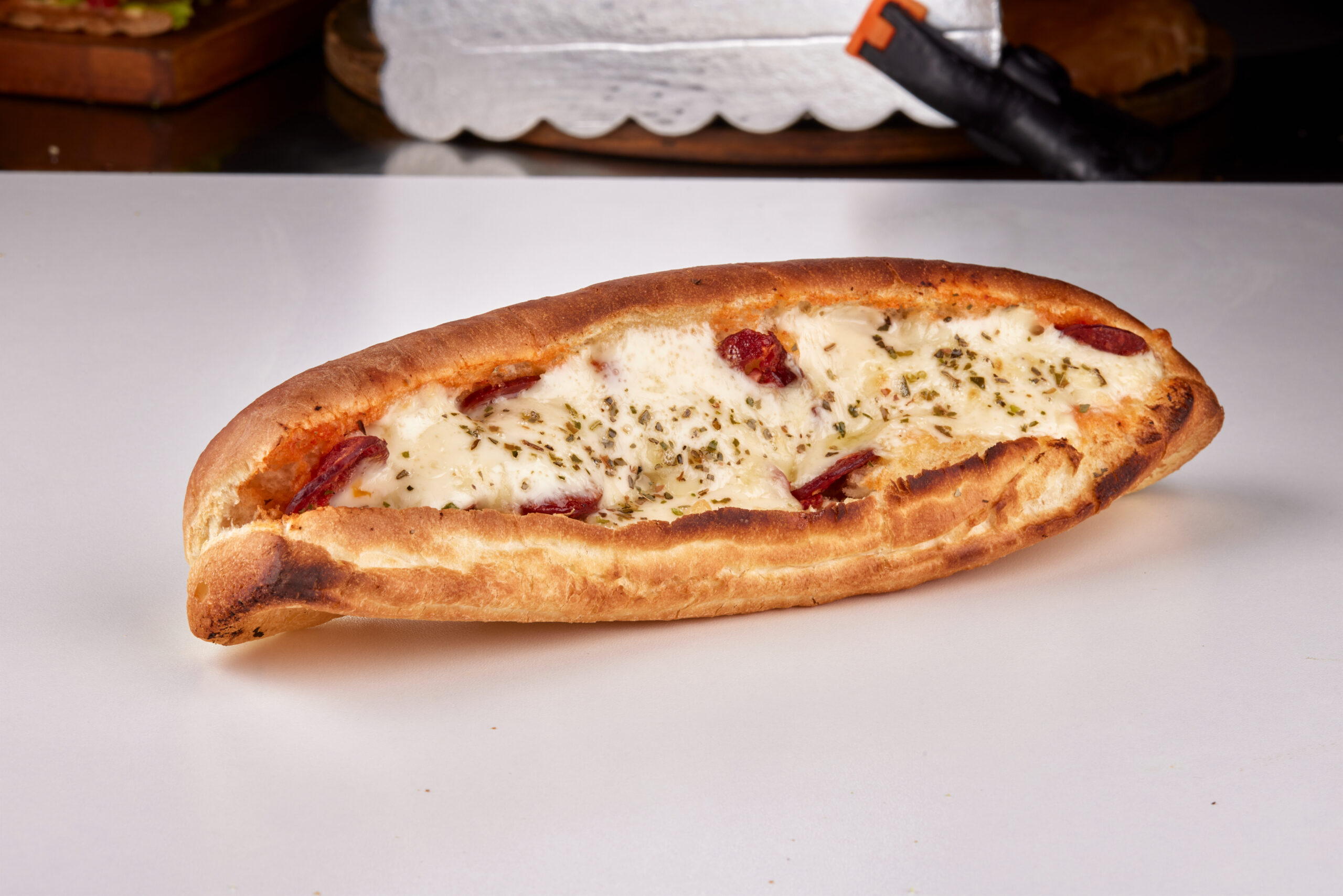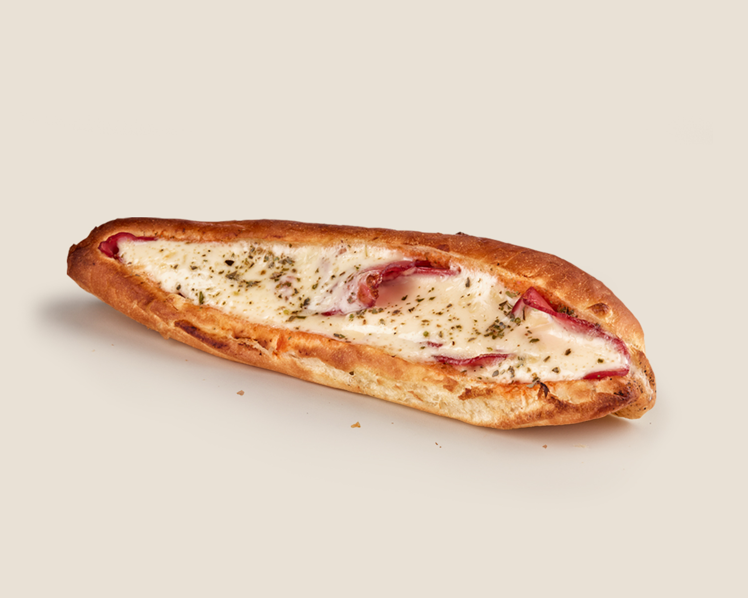 Sos domatesh, proshutë viçi, mozzarella, salcë kremoze, oregano.